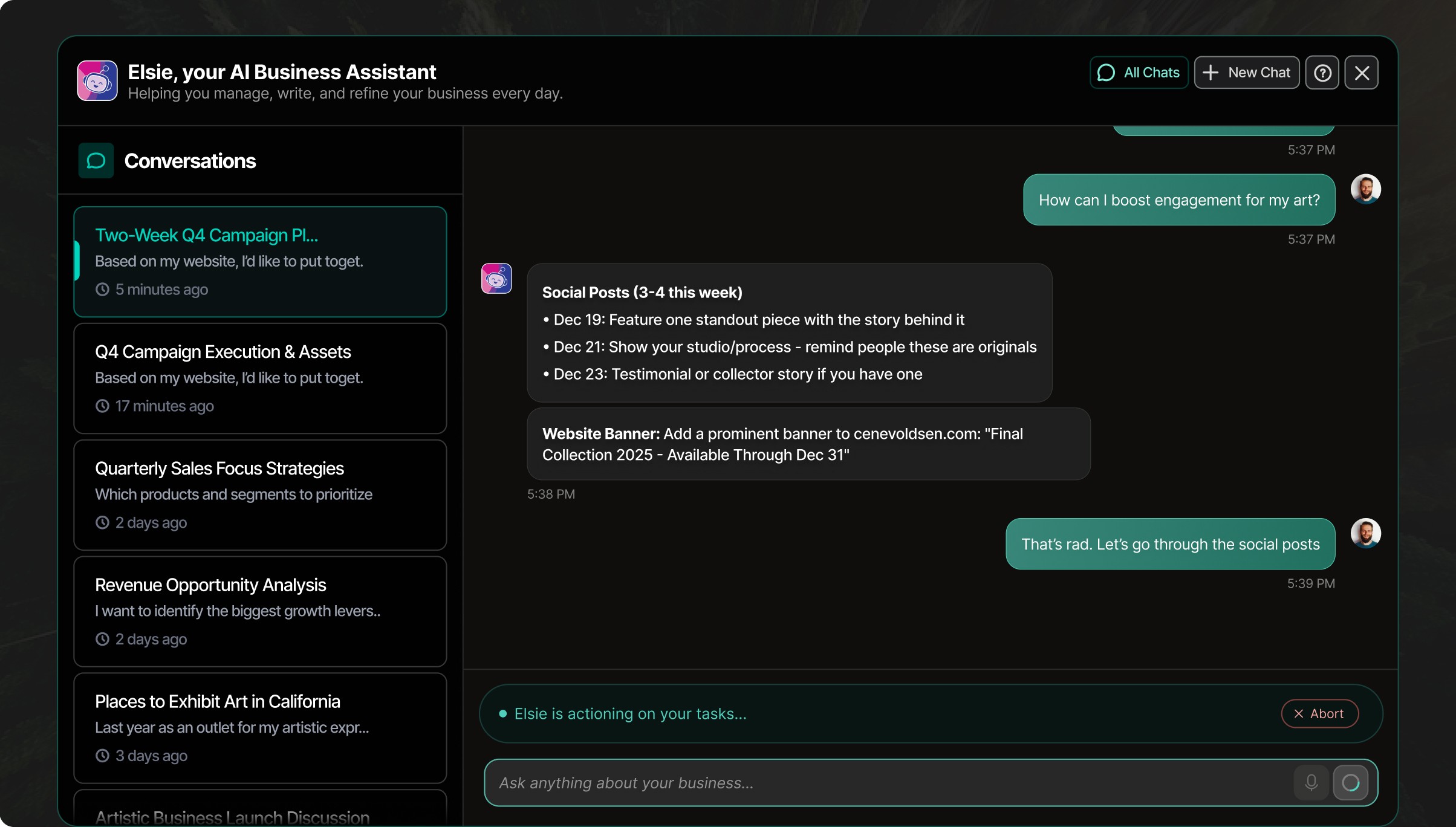 You can chat with elsie about anything: your next marketing campaign, inventory performance, or website improvements.